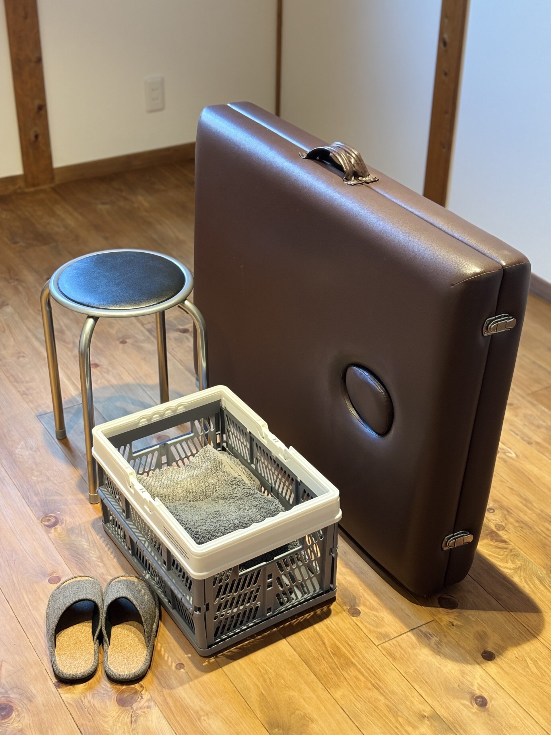 - 実際に出張整体を行うという流れになります。道具(施術ベッド・簡易マット・イス・リネン類など)はこちらで用意いたしますので、お客様は動きやすい服装とハンドタオルをご用意ください。